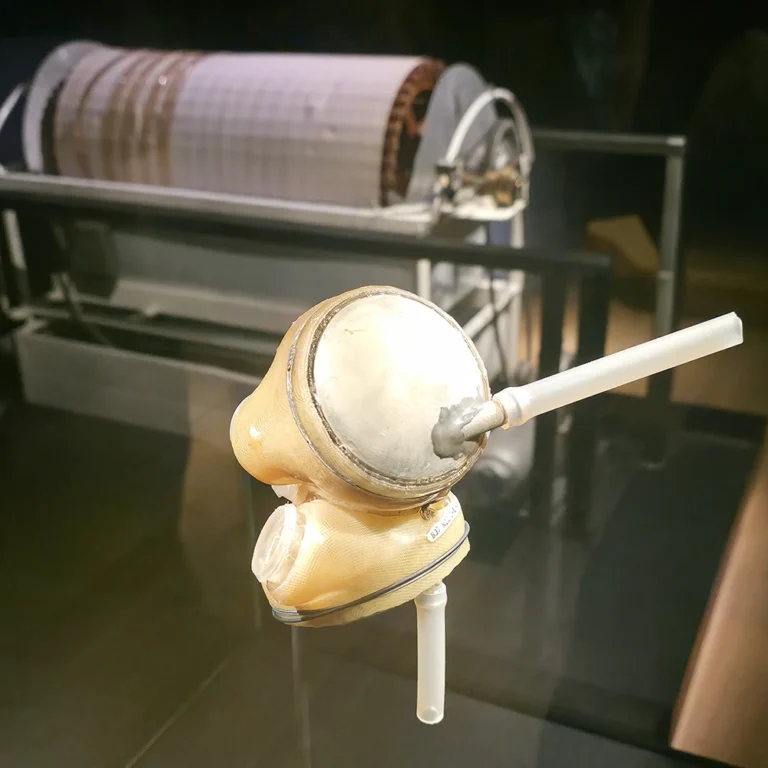 De eerste kunstnier van Willem Kolff. Gemaakt van aluminium van een neergeschoten Brits vliegtuig, een pomp uit een Ford Model T en een naaimachinemotor. Het hart van de machine was een horizontale trommel omwikkeld met 40 meter cellofaanhulzen.